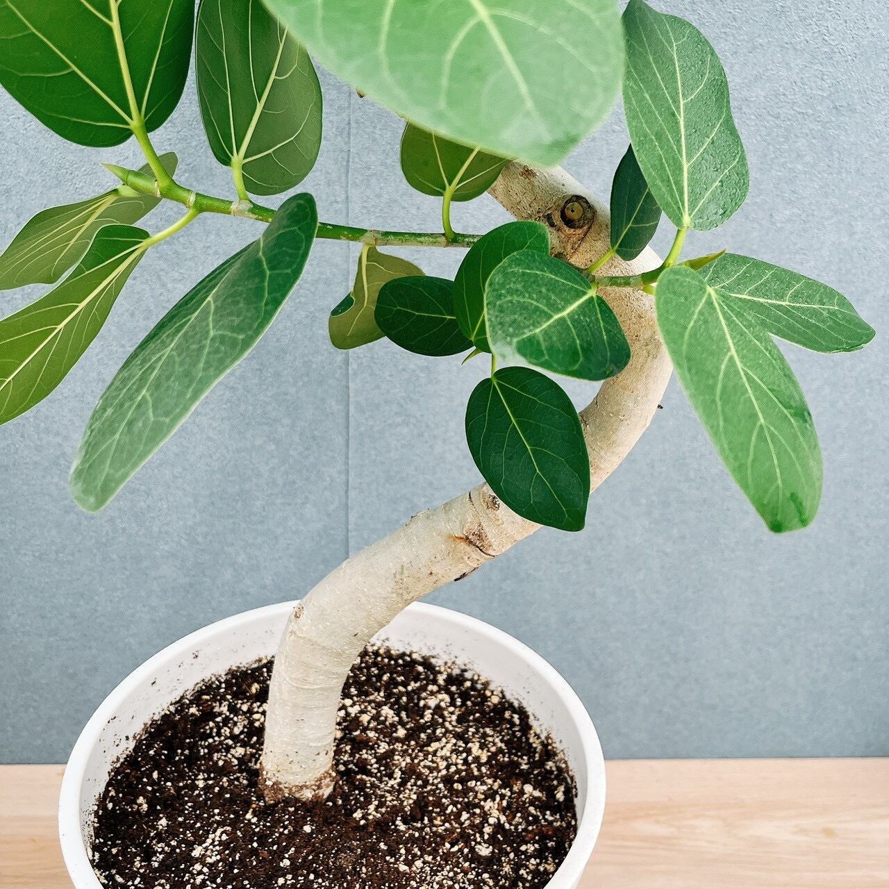 ゴムの木の中間、濃いめのグリーンの卵型の葉がおしゃれなフィカスベンガレンシスの曲がりです。