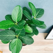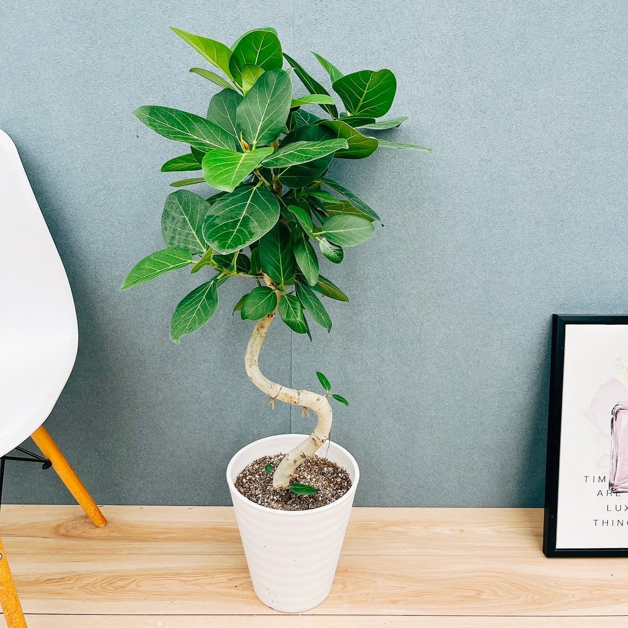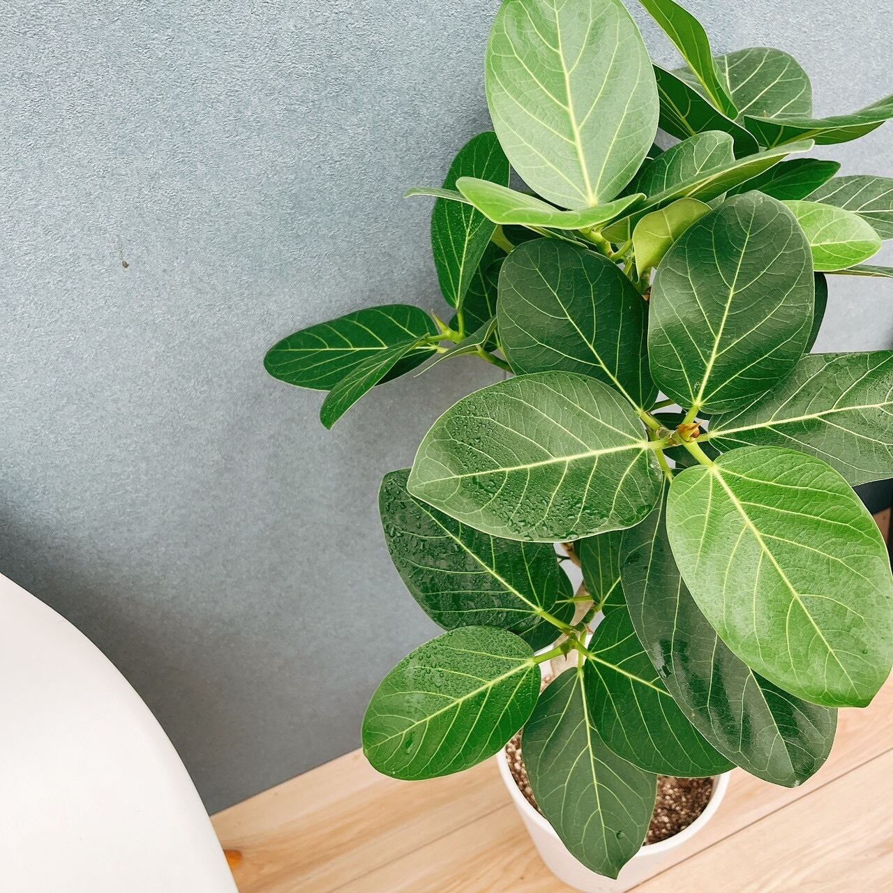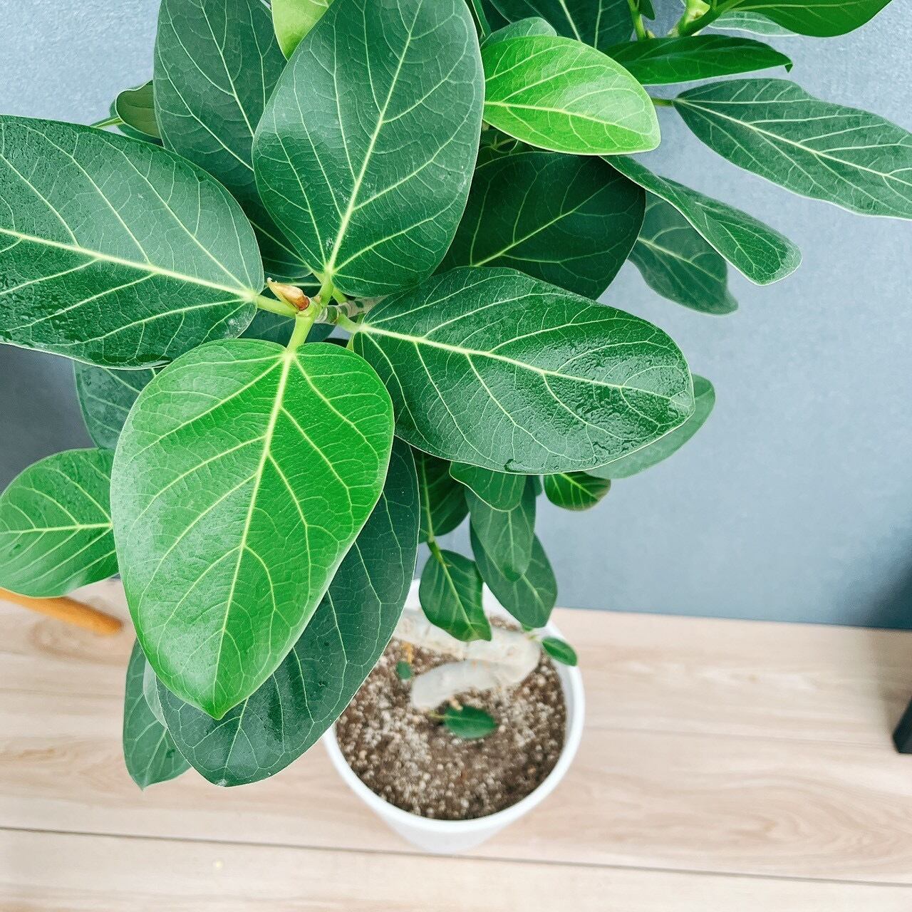 当店人気商品、ゴムの木の中間、濃いめのグリーンの卵型の葉がおしゃれなフィカスベンガレンシスの曲がりです☆