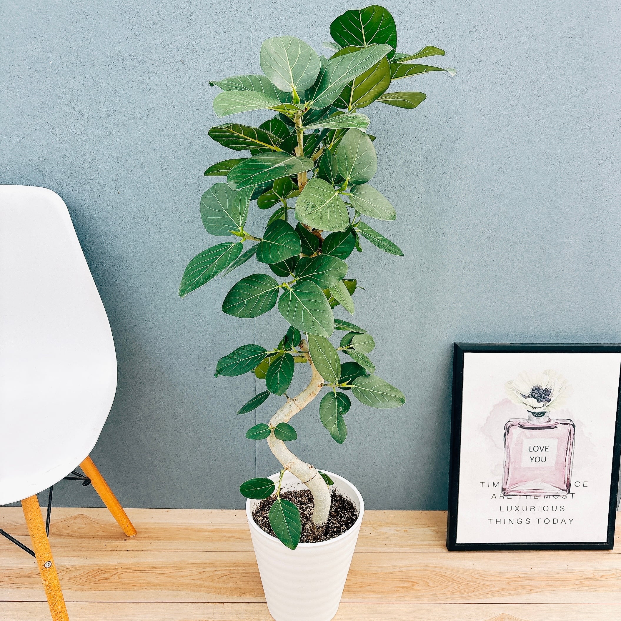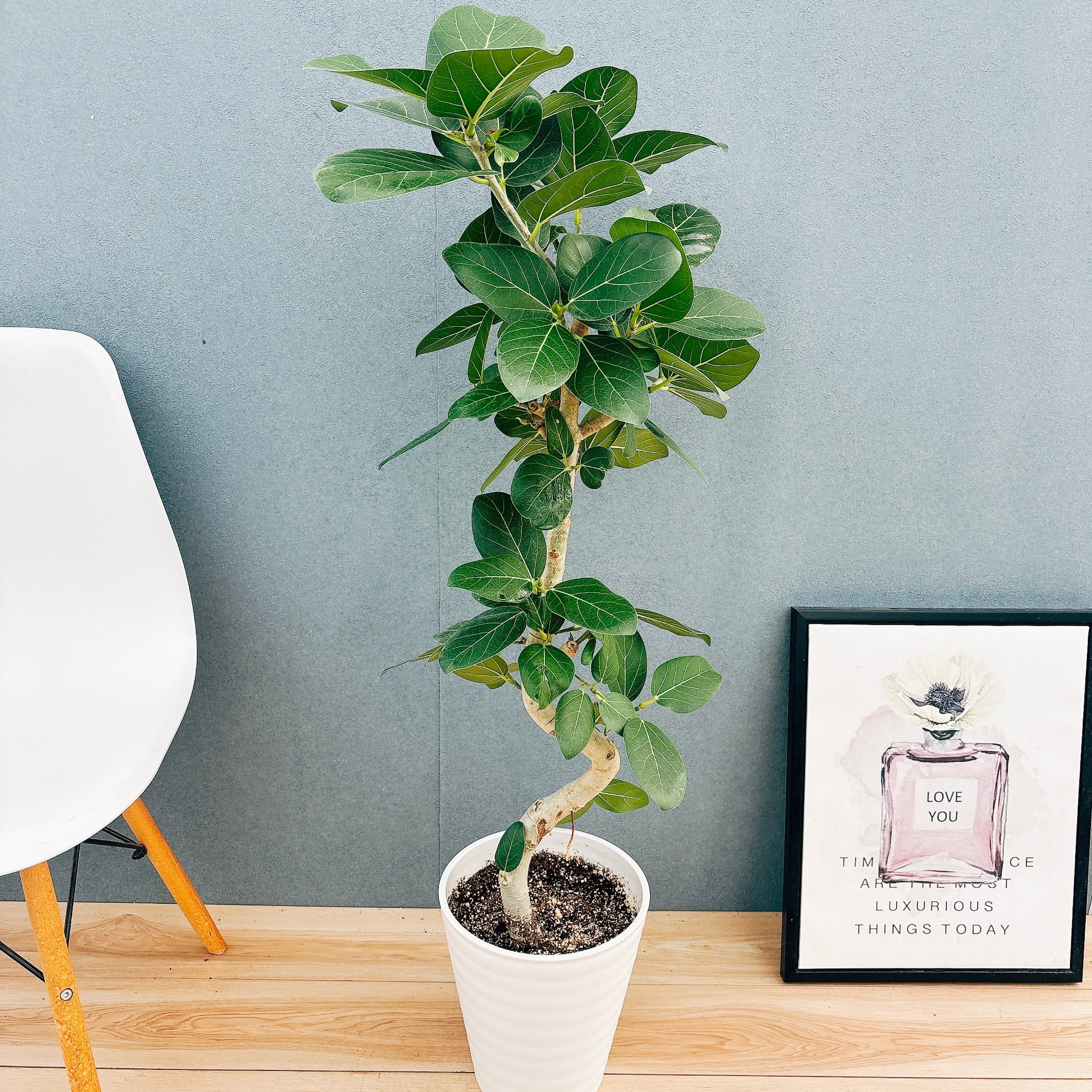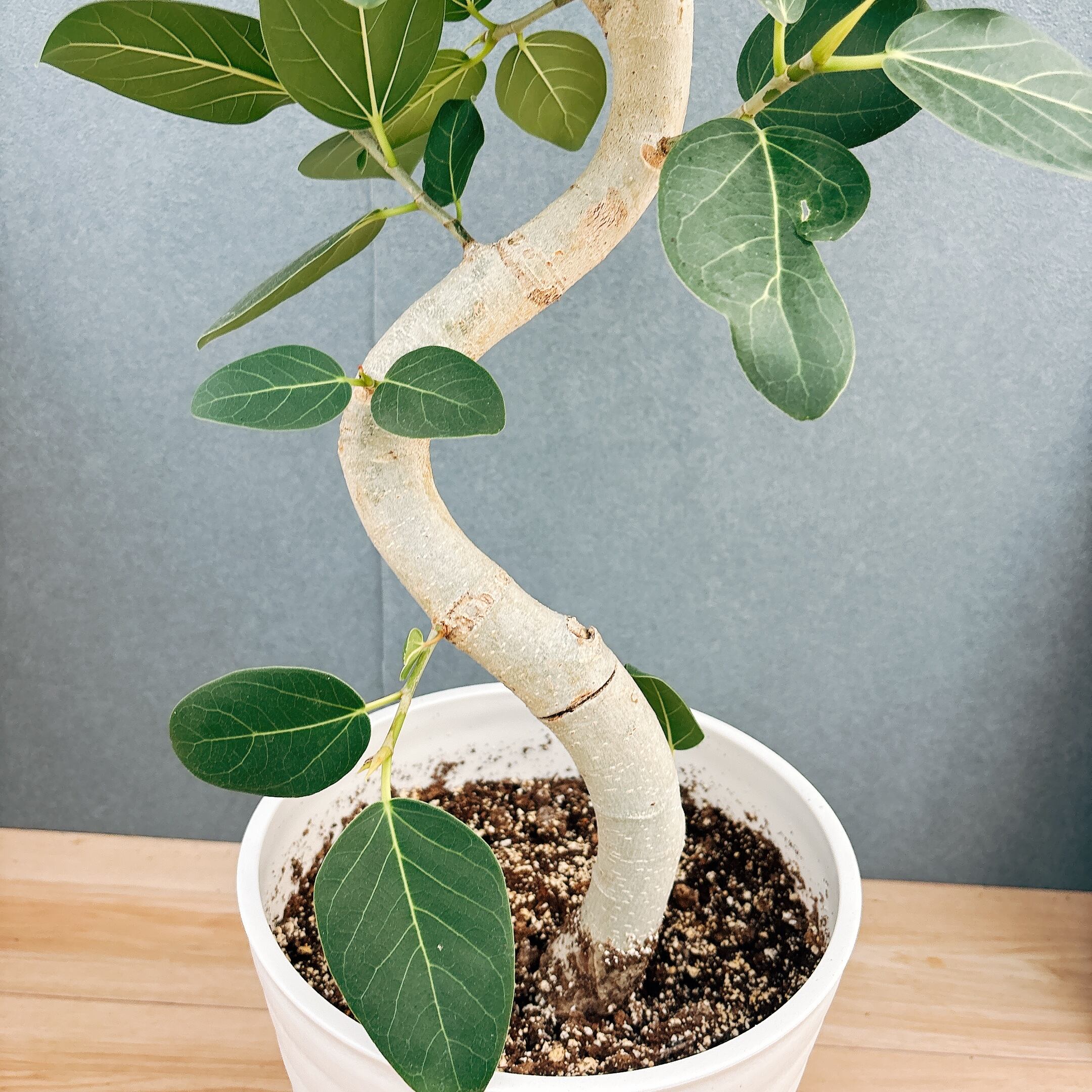 当店人気商品、濃いめのグリーンの卵型の葉がおしゃれな、フィカスベンガレンシスの曲がりです☆