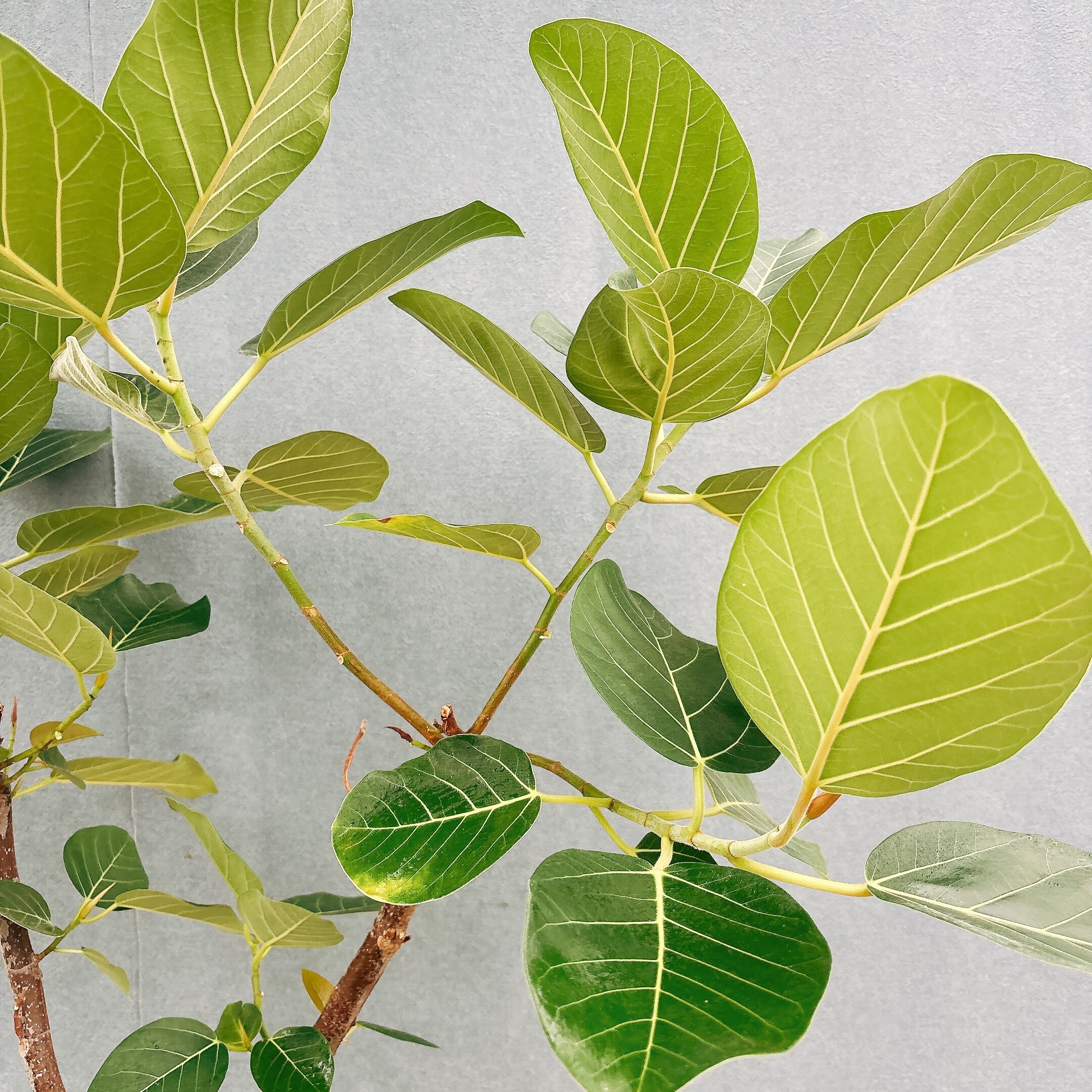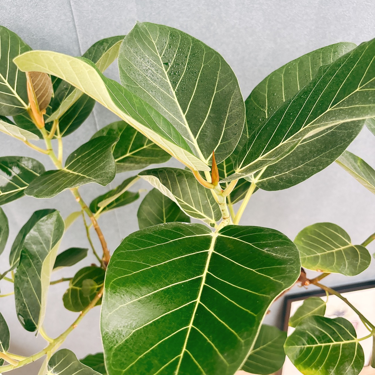 フィカスベンガレンシスに良く似ていますが、新芽はややブラウンがかった色味をしており、ベンガレンシスよりも一回り大きめの上品な葉を持ちます。