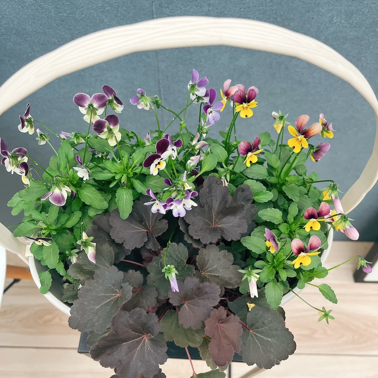 京びおらシリーズビオラ3種とべっぴんさんシリーズヒューケラ1種の寄せ植えです。綺麗なカラーリーフのヒューケラと可愛らしいビオラがおしゃれな一鉢です。