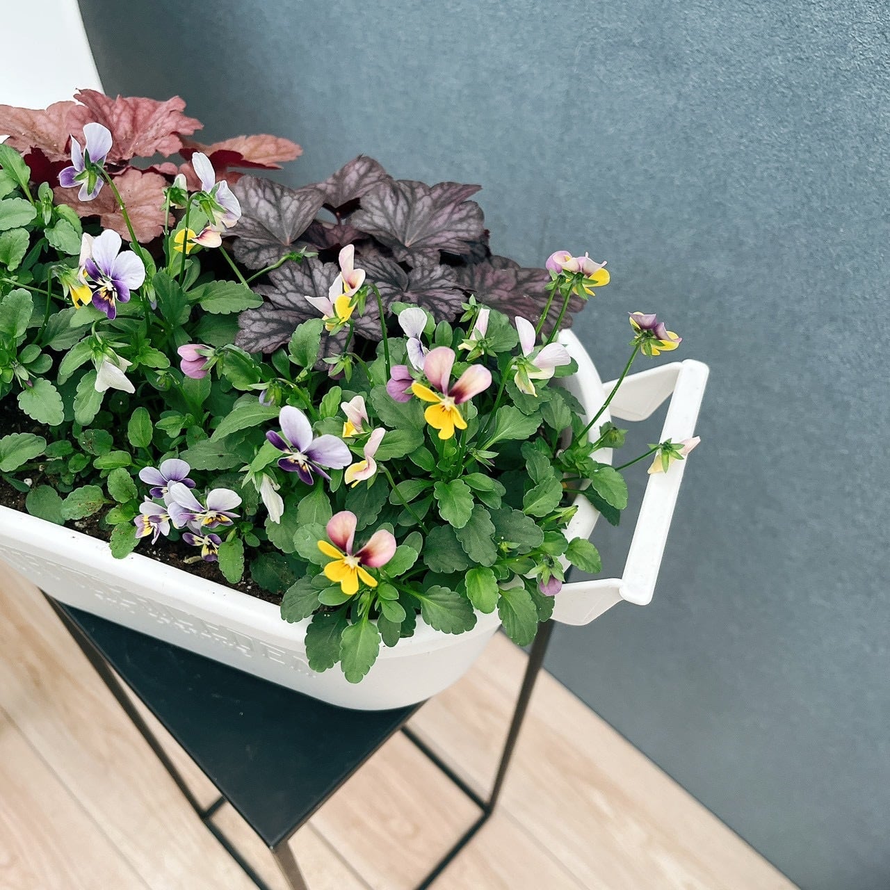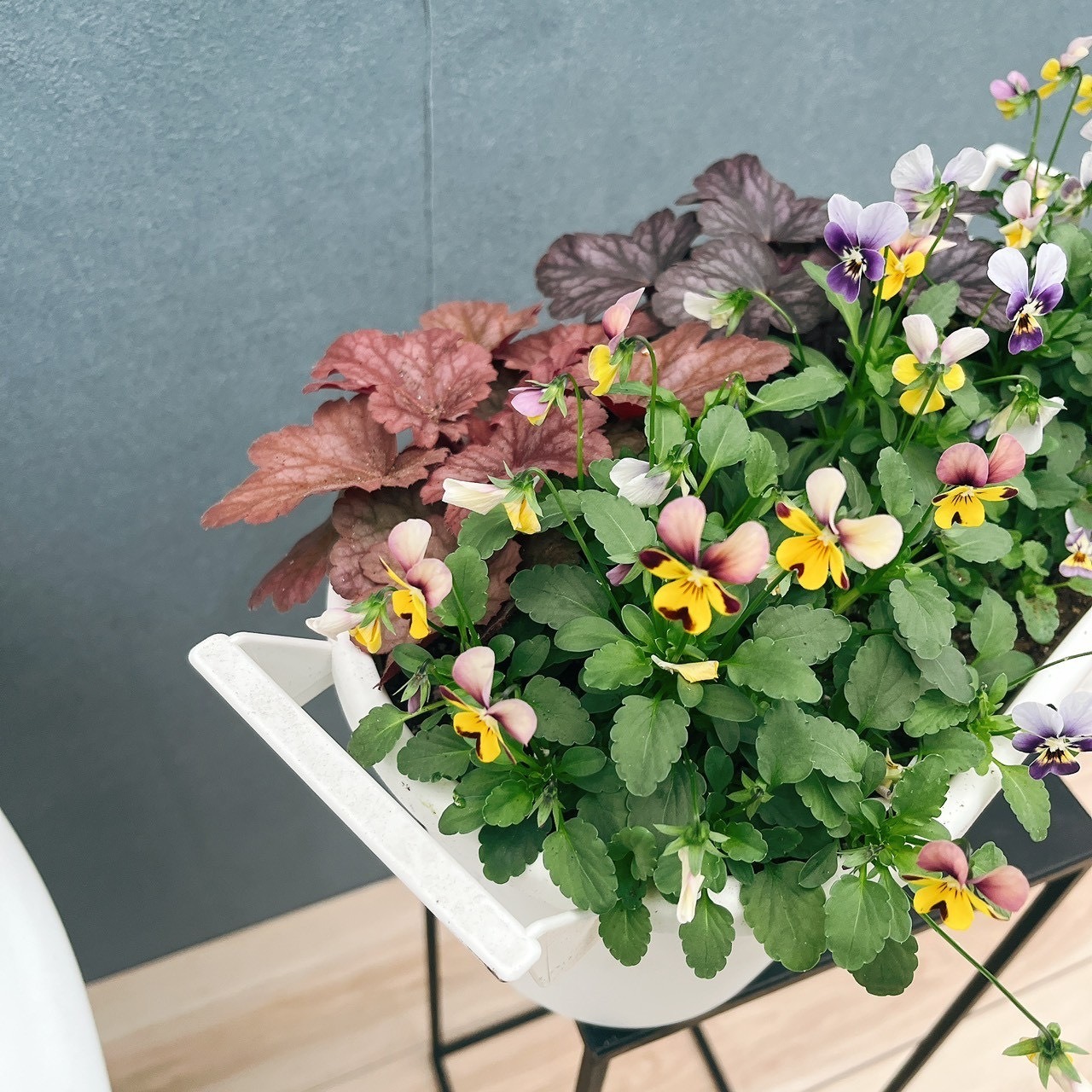 京びおらシリーズビオラ3種とべっぴんさんシリーズヒューケラ2種の寄せ植えです。綺麗なカラーリーフのヒューケラと可愛らしいビオラが素敵な一鉢です。