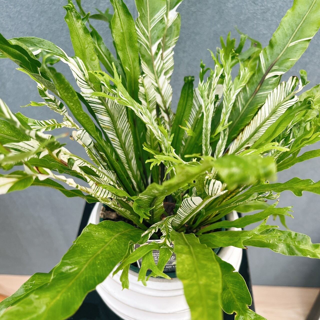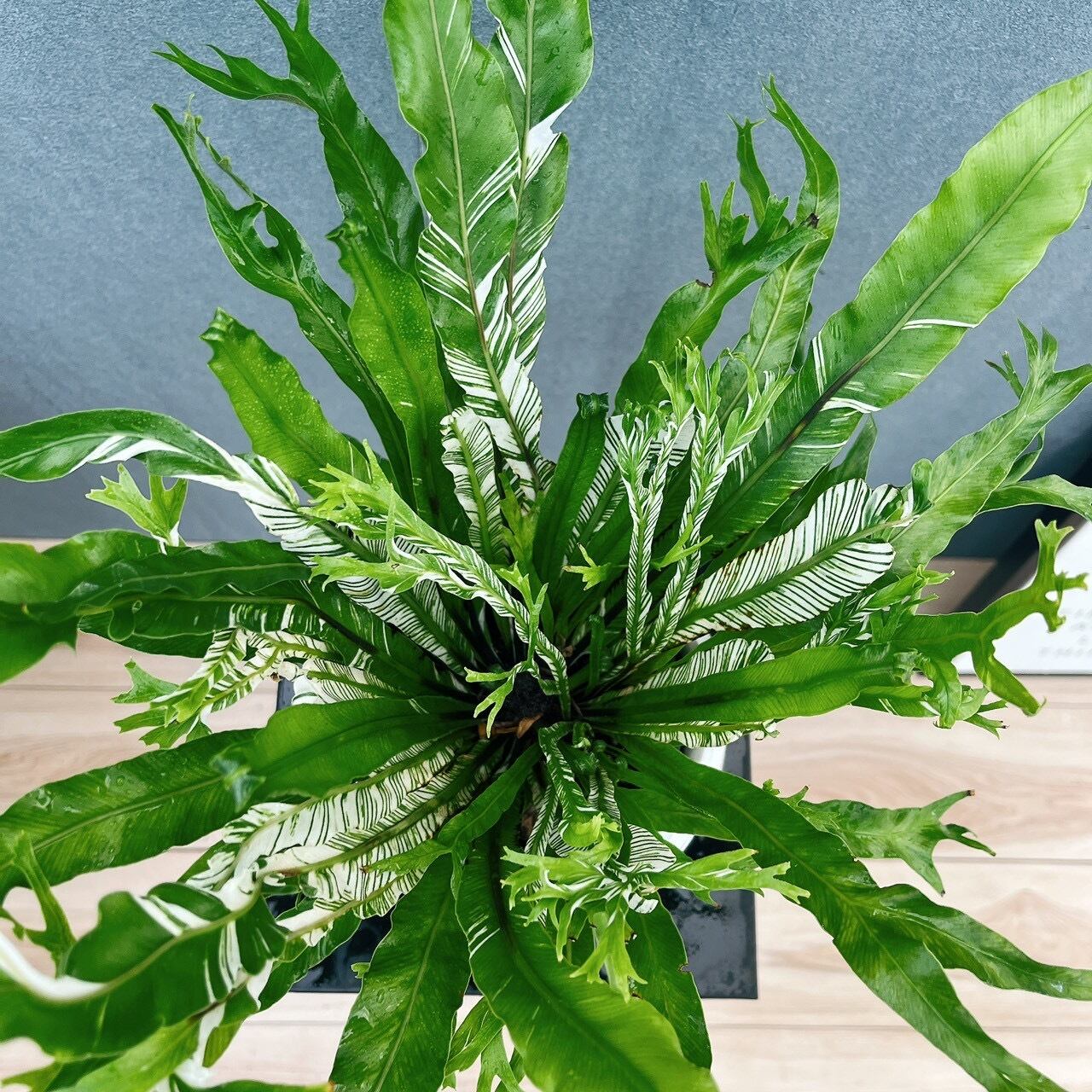細めの少し波打った葉にとても綺麗な斑の入る、アスプレニウムニダスバリエガータです☆