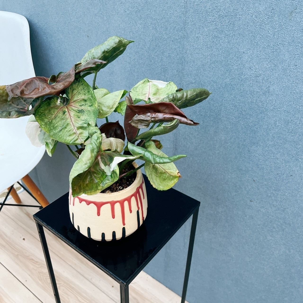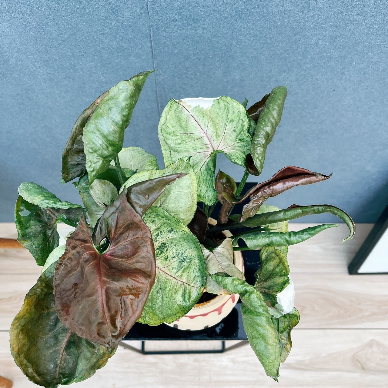 個性的な葉にピンクや白の斑が入る、半つる性の植物、シンゴニウムピンクジュエルです☆