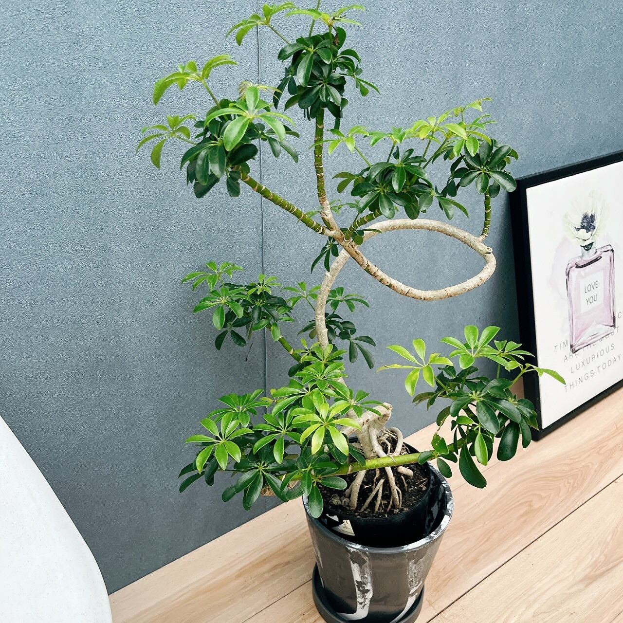 今回は、とてもユニークな曲がりのシェフレラが入荷致しました!今回一点限りのお品で、モダンでクールなブラック×ホワイトのマーブル鉢付きになります!