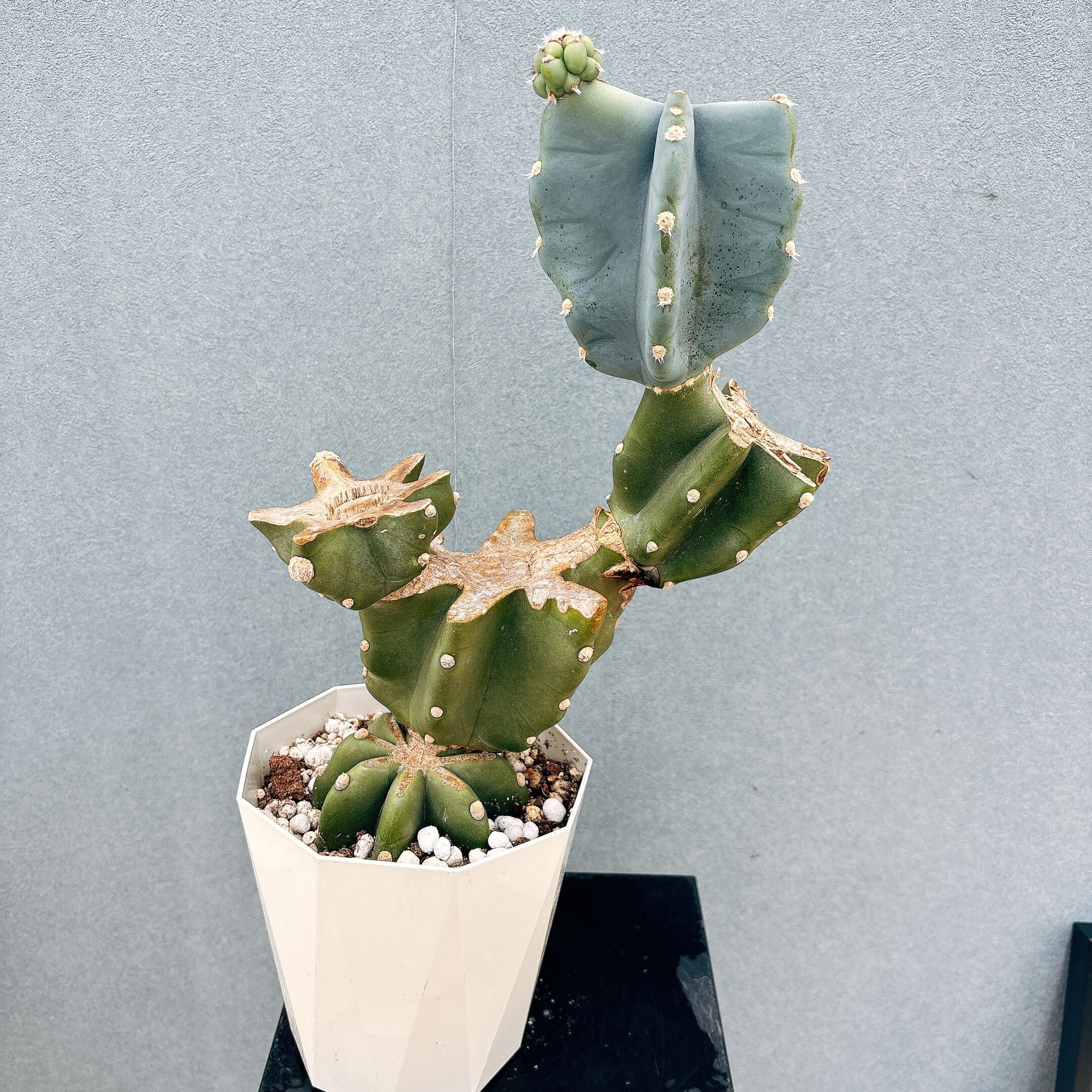 柱サボテン鬼面角は、鋭い棘がなく、丈夫で育てやすいため、サボテンを初めて育てられる方にもおすすめの品種です。こちらは、5号サイズで管理しやすく、ユニークなな樹形がおしゃれな一鉢です!