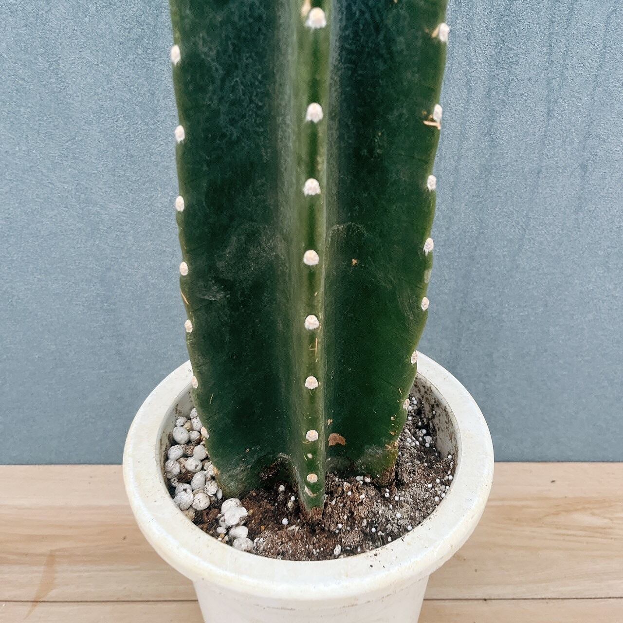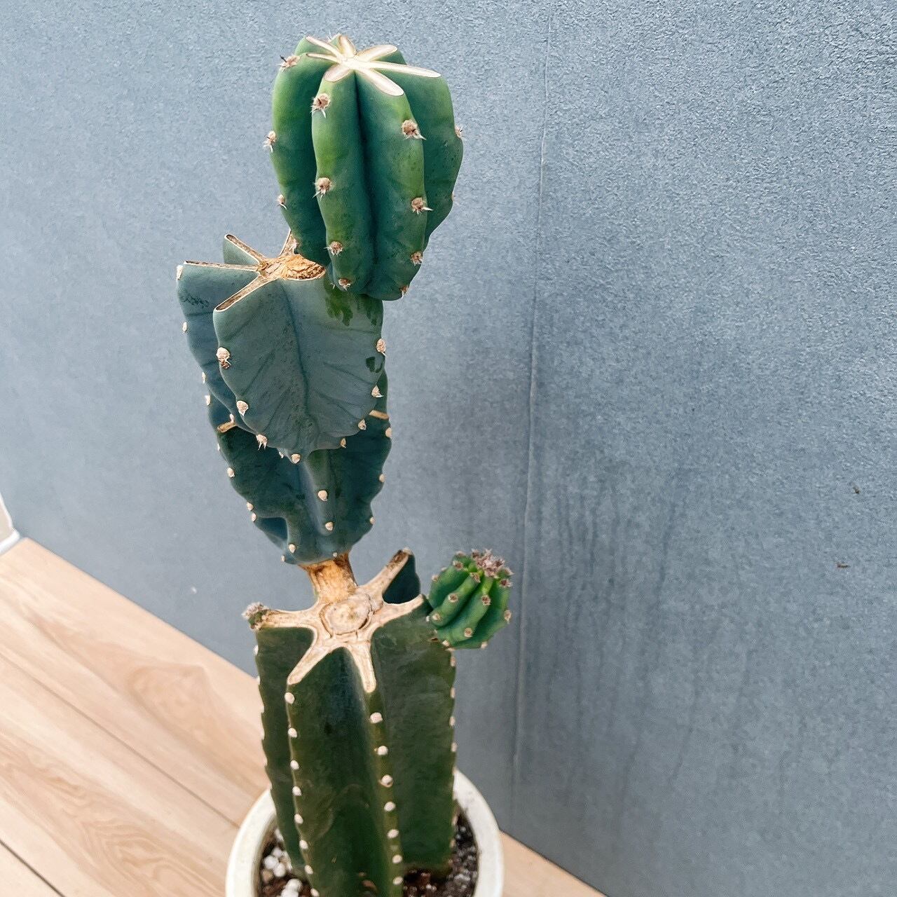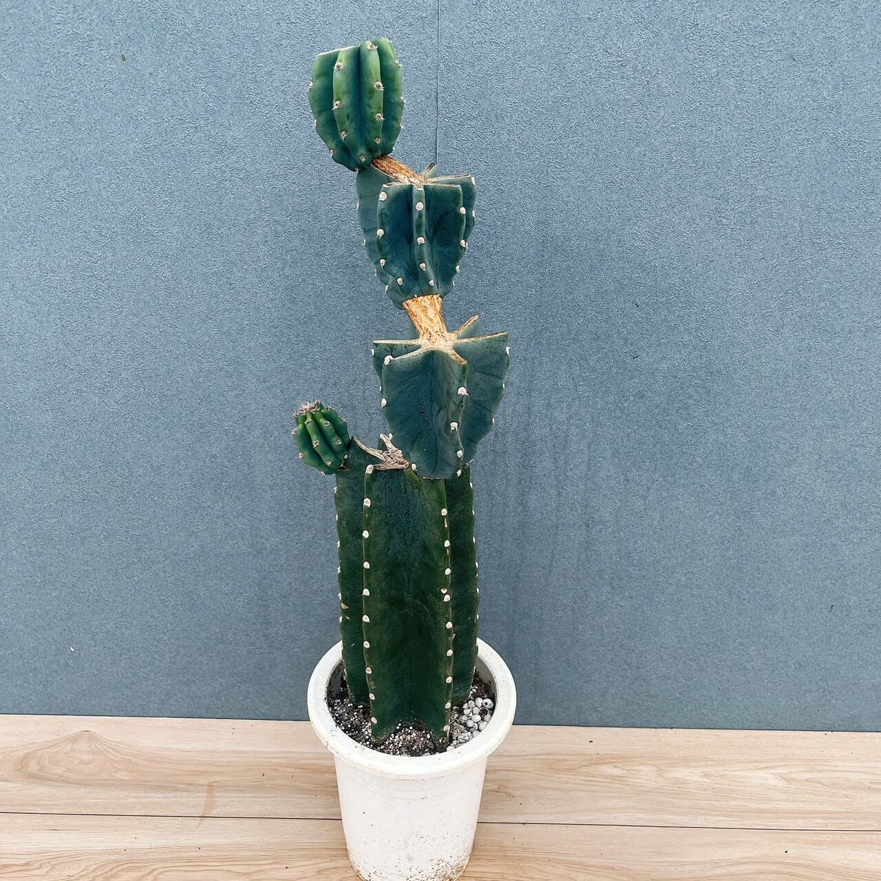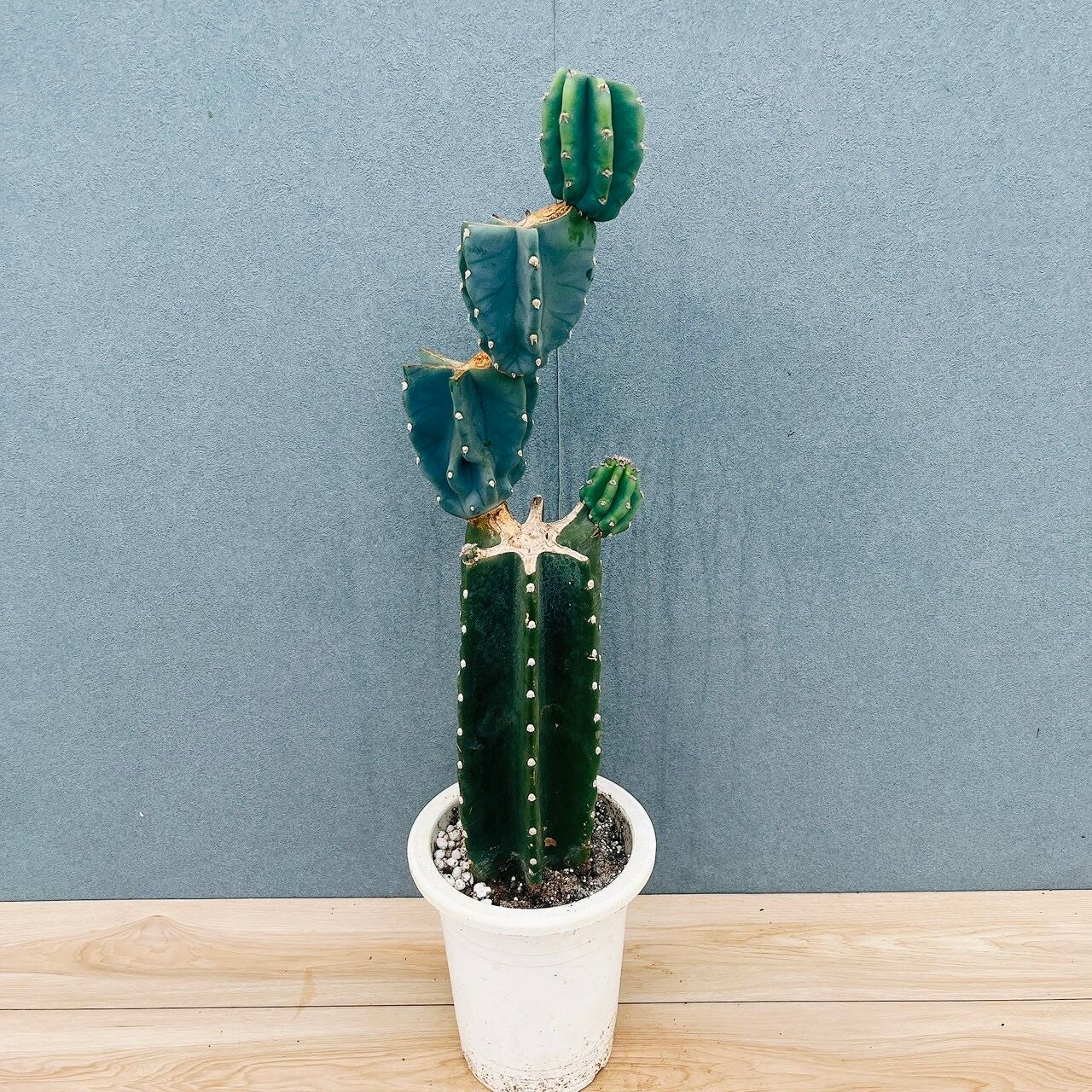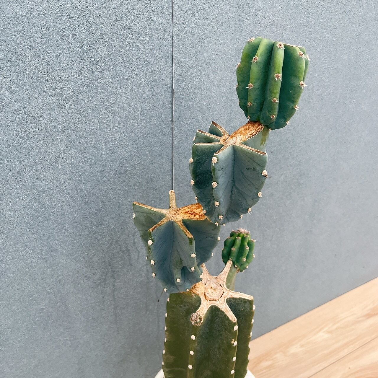 柱サボテン鬼面角は、鋭い棘がなく、丈夫で育てやすいため、サボテンを初めて育てられる方にもおすすめの品種です。こちらは、すらりとした樹形に階段のように連なるブランチがとてもおしゃれな一鉢です!