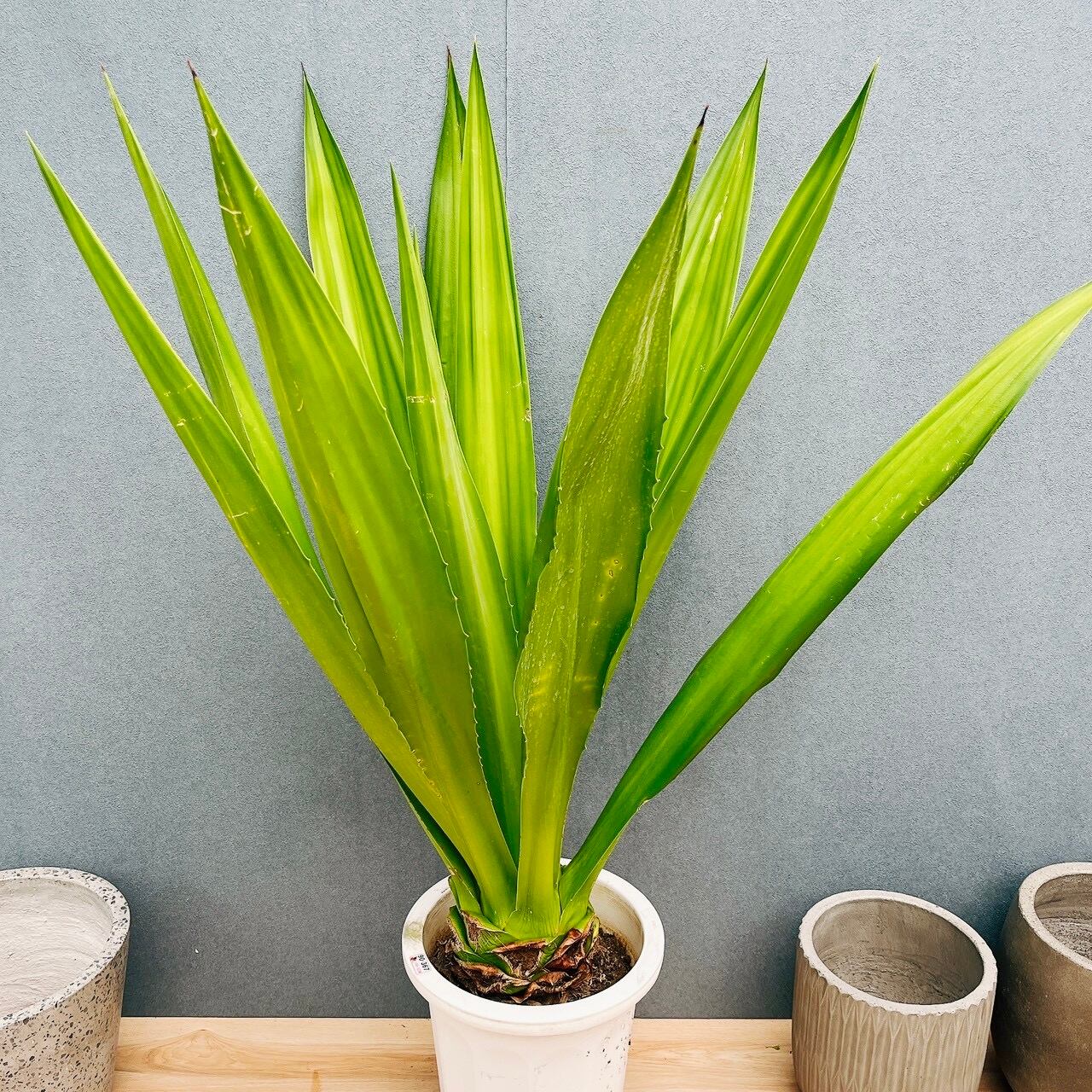 こちらの品種は明るい斑入りの葉で、大型サイズですので、存在感抜群です!暖かい地域では、地植えも可能です。